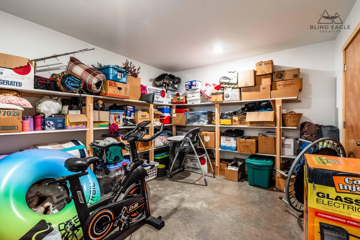 Massive garage and workshop area perfect for equipment maintenance, crafts, and storage of outdoor recreational gear.