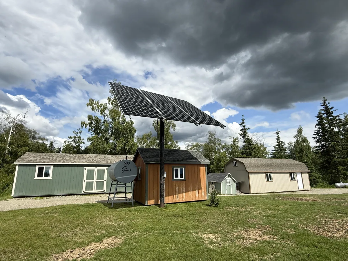 Comprehensive solar energy setup providing sustainable electricity for off-grid luxury living in the Alaskan wilderness.